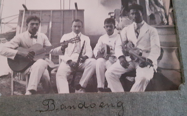 Deze foto is opgenomen in Bandoeng omstreeks 1920. Uiterst links op de foto staat Rob Maidman. Wij weten niet wie de andere muzikanten zijn maar vermoeden dat het drie broers zijn; zonen van Abraham Alexander Guldenaar en Anna Louisa Kouthoofd. In Indië was het actief musiceren een belangrijk element van het dagelijkse leven. Er werd veel gezongen, op de piano en gitaar gespeeld. Muziek bracht vreugde en plezier en leidde af van de dagelijkse besognes.